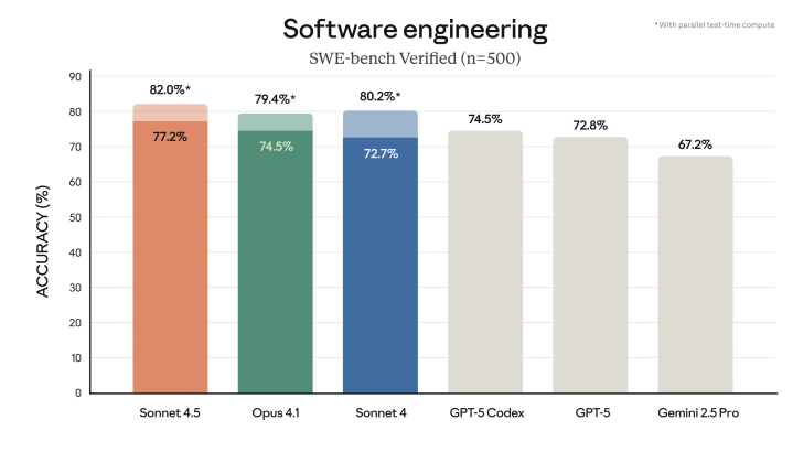 在考察真实编程水平的SWE-benchVerified测试里,ClaudeSonnet4.5登顶业界第一,比GPT-5-Codex高出7.5个百分点。